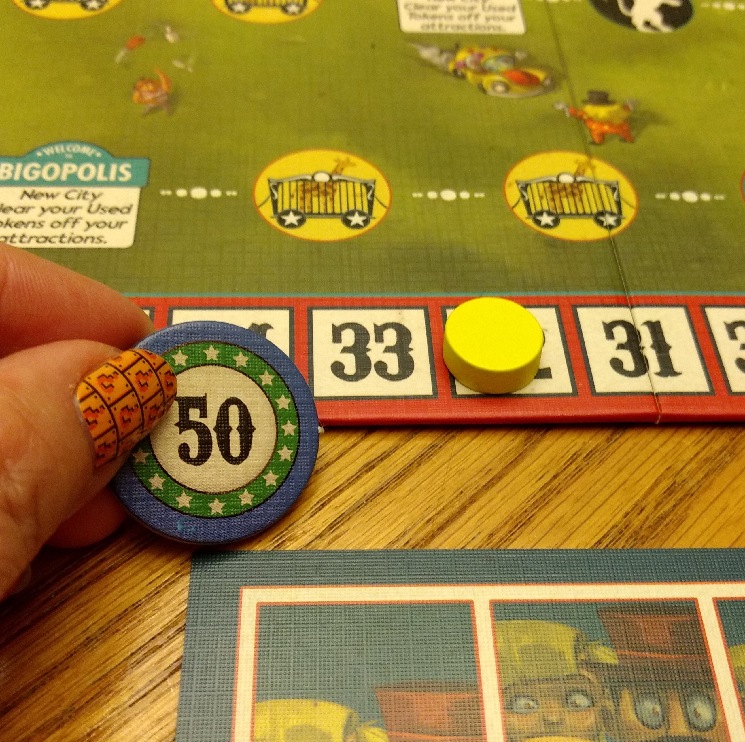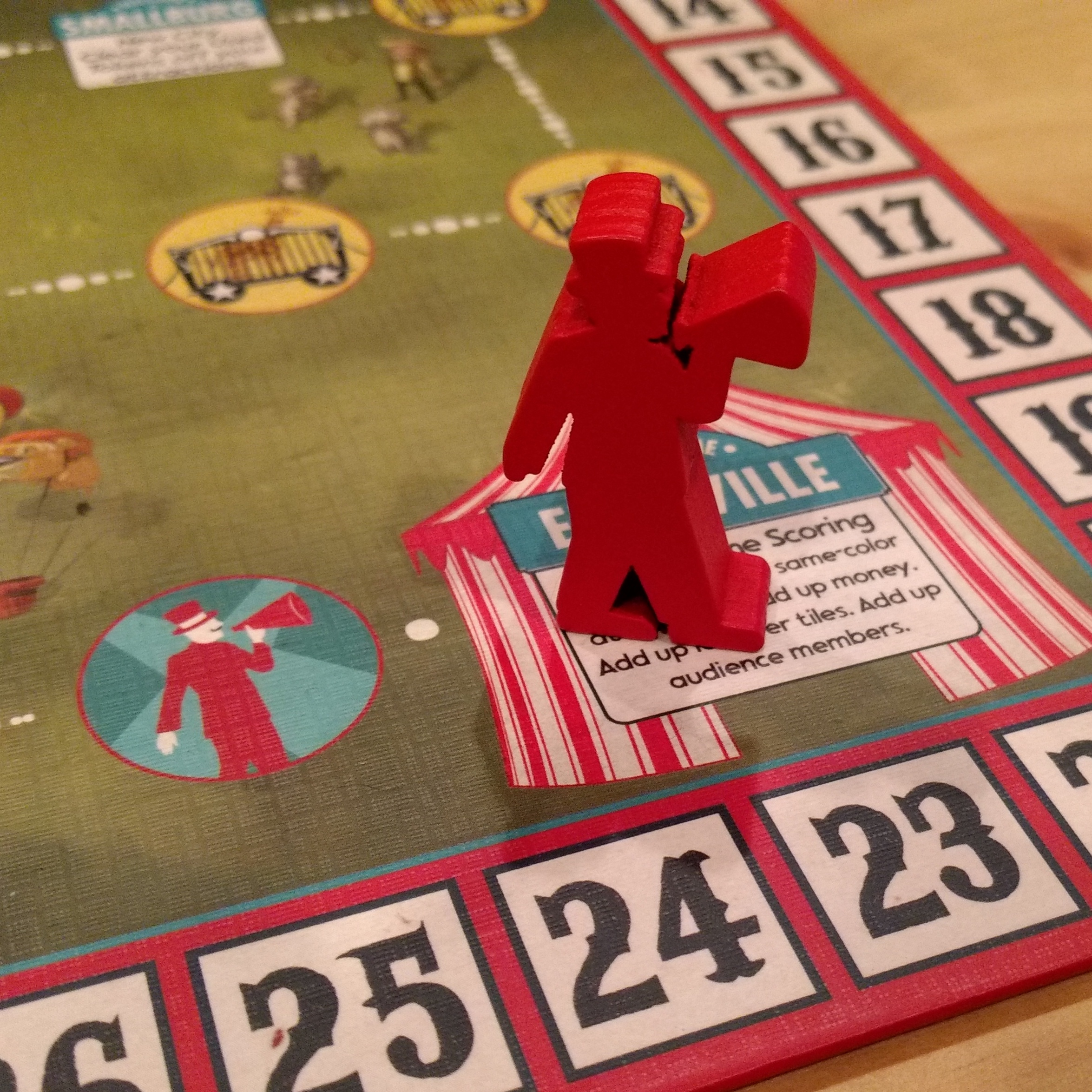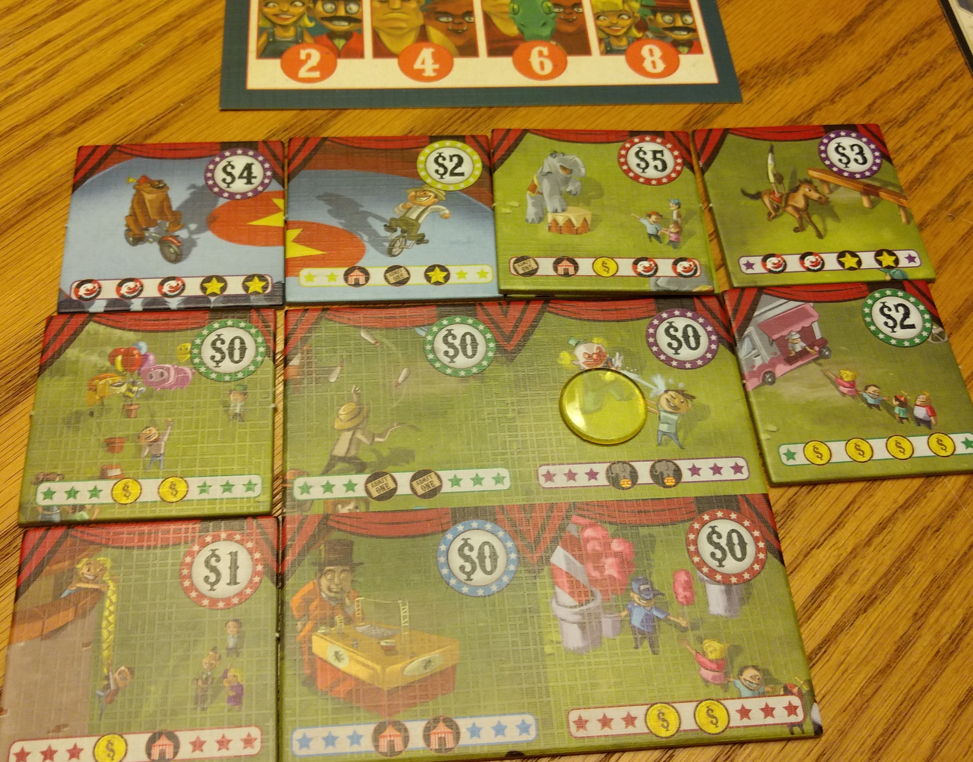 A huge note – the first edition of this game has a lot of mistakes. In the rulebook, the “clown” and “elephant” icons are mixed up, so I played this game a couple times thinking it was much harder than it needed to be. Those icons are also wrong on some of the star attraction cards. The rulebook has no explanation of the tiles with two colors, and my bleacher cards are all the same color, even though the rules refer to bleacher cards matching the color of the player score markers.